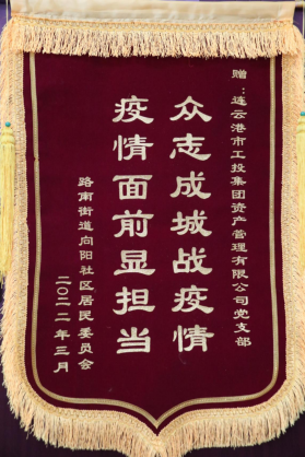 非常感谢你们对我们社区的守护,为我们居民筑牢了疫情‘防护墙’,你们辛苦了!”5月16日下午,路南街道向阳社区居委会书记王婷一行,专程来到资产公司送来一面印有“众志成城战疫情,疫情面前显担当”的锦旗,代表社区居民向资产公司党支部今年疫情期间援助向阳社区中所作贡献表示敬意和感谢。