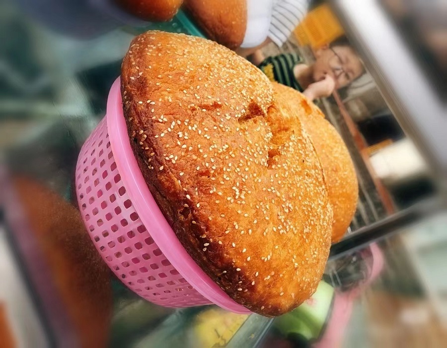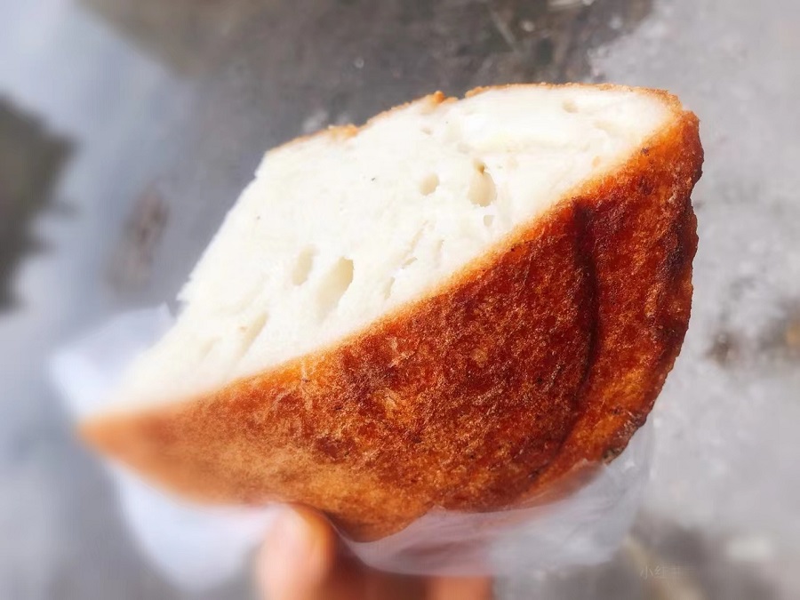 它的做法看似简单,其实非常考量主妇的功底。面粉加入老酵,放在暖和的地方让其自然发酵至涨满容器。自家的土灶保持最小的火星,锅内刷上薄薄一层油,倒入面糊。面团在锅中慢慢膨胀,待一年微微发硬,变焦黄色,撒上一层薄薄的芝麻,刷上一层油,翻面继续小火慢焗。看似简单,其实没有几年做饭功底,还真不一定能成功。一个成功的涨烧饼,外脆里软,内里一个个孔洞,松软有弹性。我比较喜欢吃外皮,香脆,可口,老年人多爱吃内里,有种老酵的清香,微甜。它真的是一款老少皆宜的美味了。