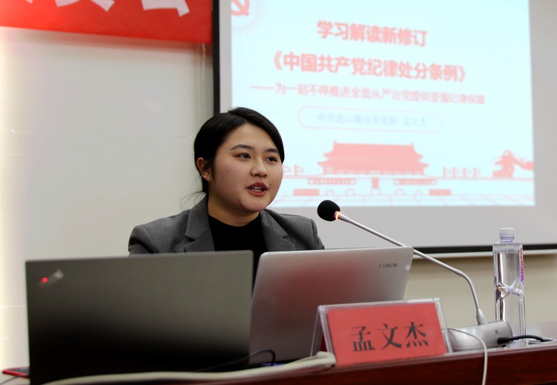 学《条例》,明纪律。特邀请市委党校孟文杰老师,对新修订的《中国共产党纪律处分条例》进行专题辅导。孟老师从深刻理解《条例》修订的重要亮点、准确把握《条例》修订的主旨要义、切实抓好《条例》的贯彻执行三个方面作了精彩解读,并坚持理论密切联系实际,结合与修改内容相关的案例及视频,提醒广大党员干部严于律己、防微杜渐,让全体党员干部受益匪浅。