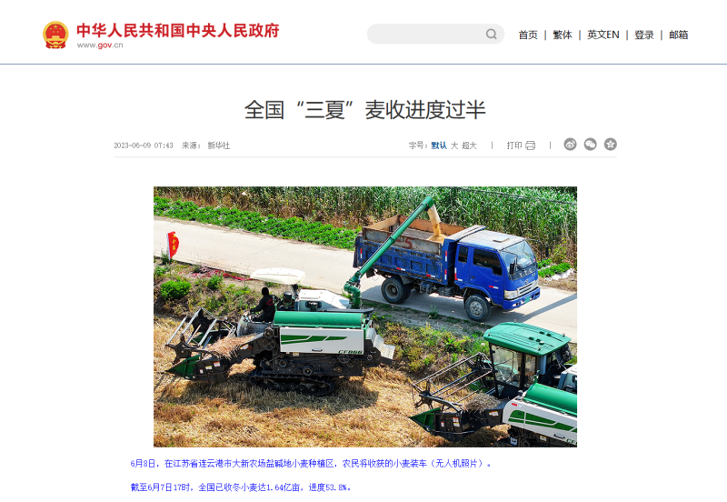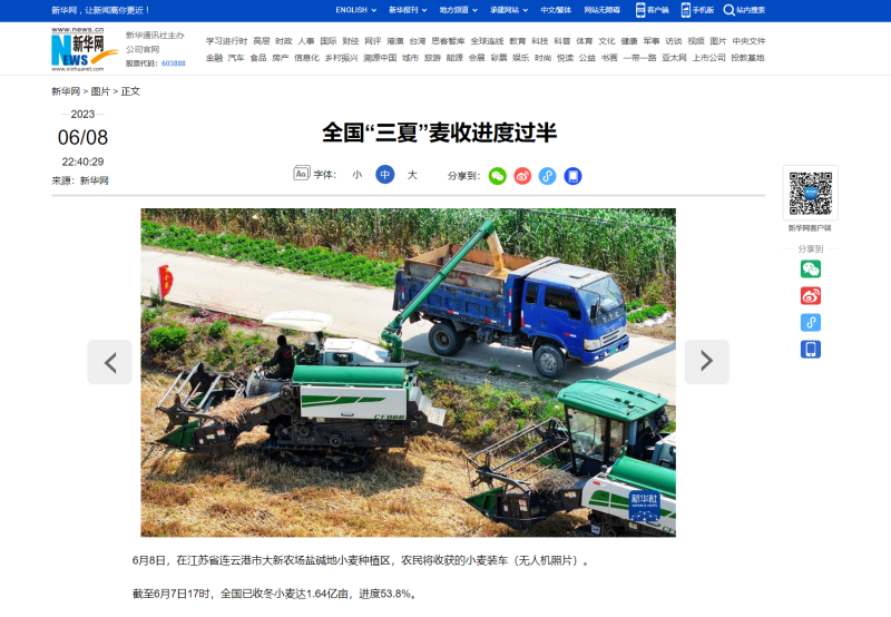 自6月8日麦收工作启动以来,青口投资公司高度重视、精心组织,科学高效调动全方面因素,全力投入耐盐碱小麦收割工作,开创了农业高质发展新局面,受到了中国政府网、人民网、新华社、新华网、连云港日报、苍梧晚报等中央、省市级主流媒体的广泛关注。(青 宣)