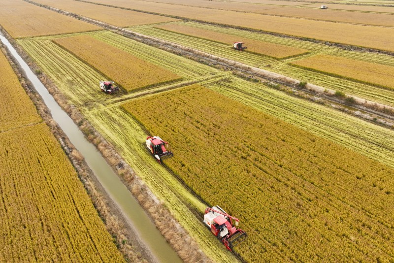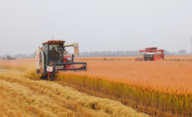 稻田里,收割机正马力全开,不断在田间穿梭,所到之处一排排水稻被整齐地收割下来,割稻、脱粒、吐秆一气呵成,空气中弥漫着稻谷清香。