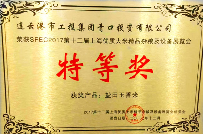 2017第十二届上海优质大米及精品杂粮展览会,我公司“盐田玉”大米荣获特等奖,这是继江苏好大米称号之后的又一重大殊荣。