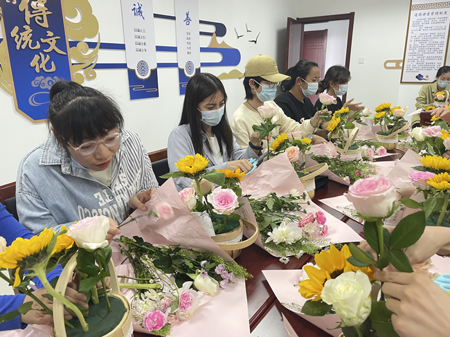 接下来,女工委组织了插花活动,特邀插花老师现场讲授插花知识及技法,借用花木来抒发女职工以花感人,以花育人,意在培养女职工善于表达对母亲的爱及祝福。在花艺师的悉心指导下,女职工们用自己灵巧的双手,尽情发挥创造力,为母亲制作一个美丽、饱含感恩之情的花篮。