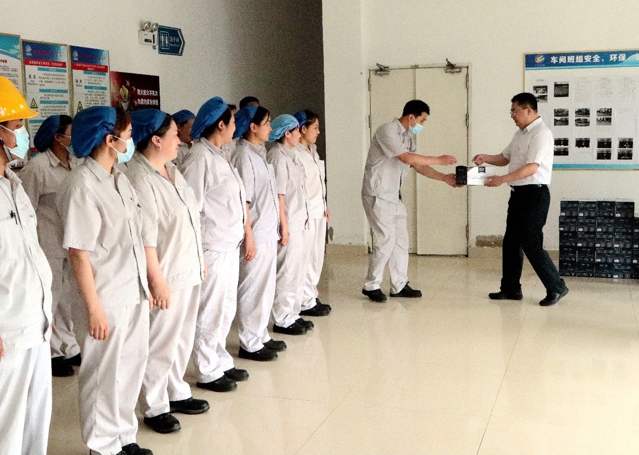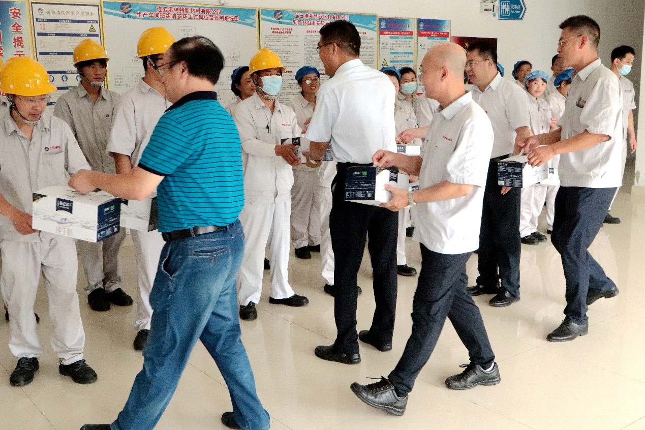 7月28日上午,云开平台公司党委副书记戴鸿鸣、工会主席刘承志一行到公司慰问生产一线员工,为生产一线员工送来牛奶、绿豆、白糖、大米等防暑降温慰问品。公司董事长张斌、总经理韩立新等领导陪同。