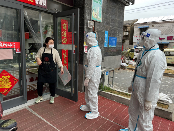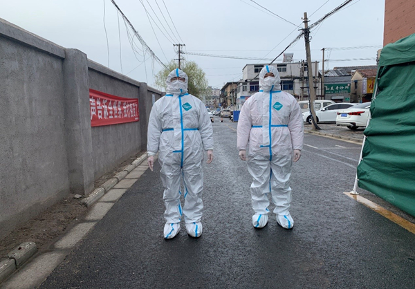 公司员工范益杨、李梦达是云开平台抗疫志愿队的队员。在冷冽寒风中,他俩身穿防护服挨家挨户通知商户暂停营业,同样的通知话语不厌其烦的重复着一遍又一遍,说得口干舌燥、疲惫不堪也未能阻拦他们继续前进的脚步。
