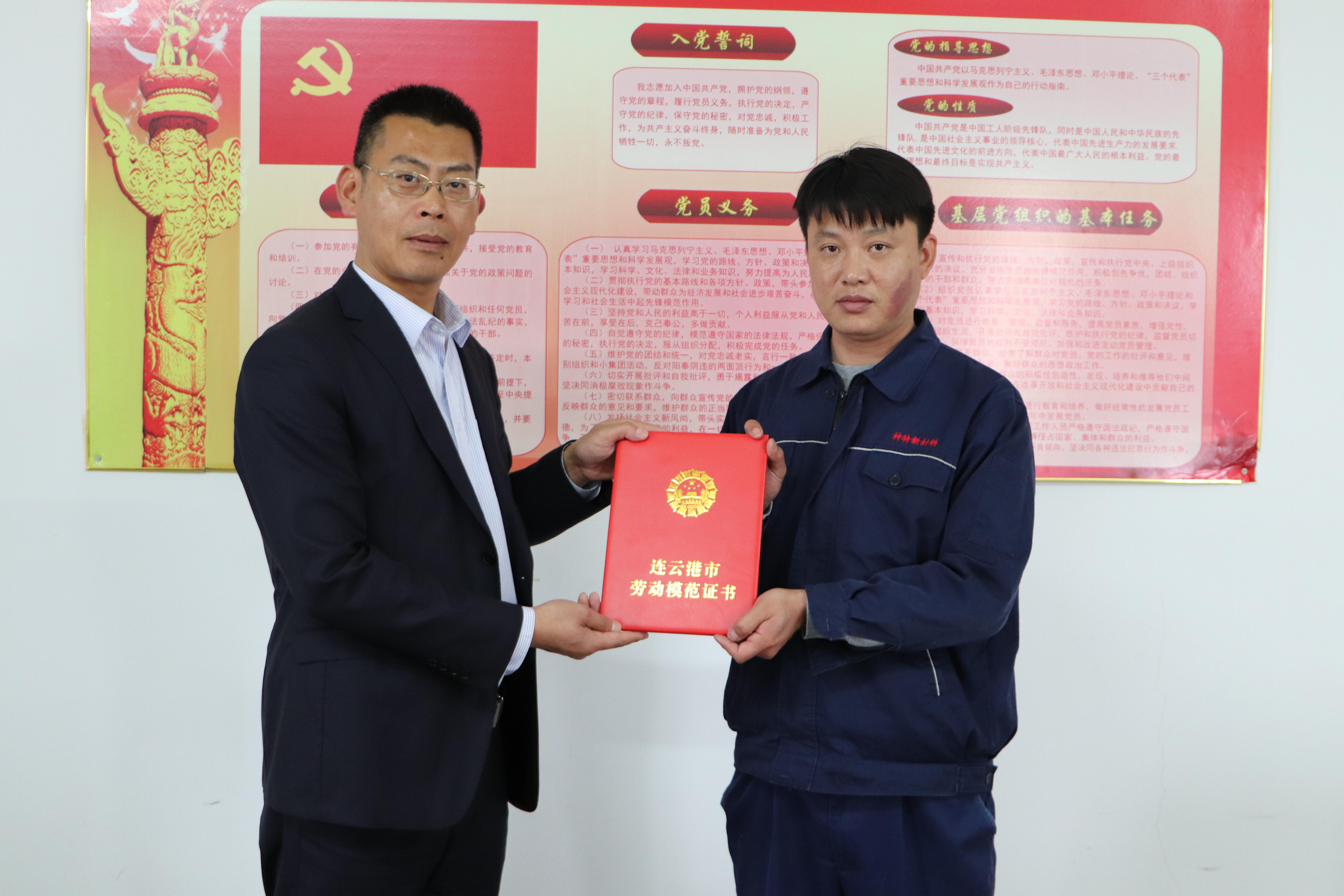 近日,我公司员工封安获得连云港市劳动模范殊荣。封安同志现为公司生产车间甲班大班长。他,九载如一日,始终保持着执着、敬业和精益求精的精神,在平凡的岗位上做出不平凡的业绩,诠释了新时代工匠精神,展示了劳动者模范风采,成为一线工人的杰出代表。