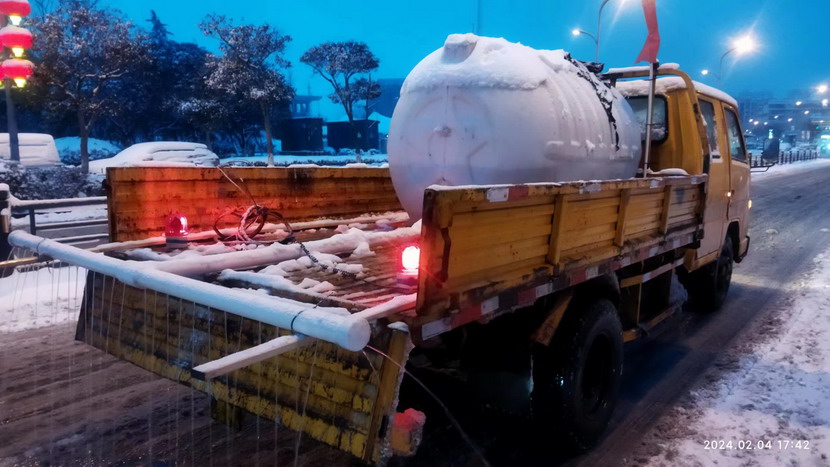 今天(2月4日),港城普降暴雪,台北华茂全员出动500余人次,大小机械100余台(班),全力确保了辖区交通线畅通。这中间,出现一台除雪“核武器”,这就是翔立分公司自制的钙液喷淋除雪车。