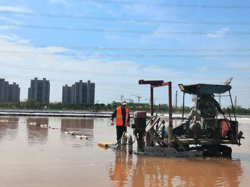 秋高气爽,这片百年的原盐生产基地进入了收获的旺季,一台收盐车在晒盐池中进行收盐作业。
