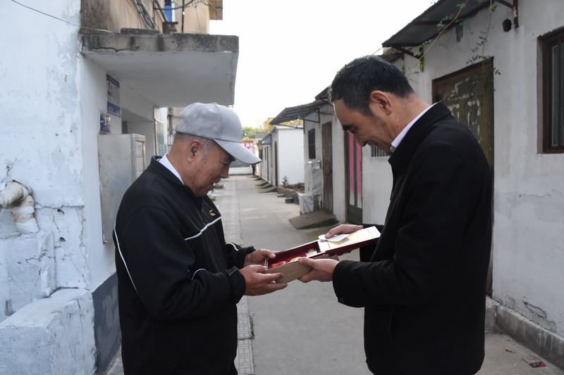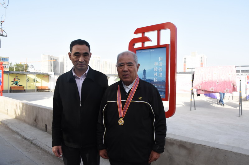 解韵波同志今年83岁,1956年1月参军,那年19岁,同年6月经过短期高强度培训,作为无线电通讯兵出国抗美援朝。1959年西藏达赖云开平台发动叛乱,刚回国不久的解韵波作为无线电技术兵种随即跟随大部队入藏平叛。至今他仍保留着抗美援朝军功章,入藏平叛军功章、纪念章等。1962年退伍分配至台北盐场工作,1997年退休。今天慰问的时候,在邻居们的簇拥和艳羡之中,还没进家门,邻居们就迫不及待地要求打开“纪念章”一睹风采。纪念奖章挂在老战士胸前,一众邻里夸赞不断:这份荣誉沉甸甸的。这份荣誉是拿命换来的。这是不得了的荣誉啊。这样的老兵是我们的宝贝哦,我们要尊敬啊。……就在小区活动广场上,老战士与大家畅谈起保家卫国光荣的战斗经历,烽烟往事历历在目。退伍后,不褪军人本色,几十年如一日立足家乡建设,为台北盐场奉献青春,为国家建设贡献力量。大家对解韵波老战士的革命战斗和建设祖国的历程表示由衷赞叹和敬佩。