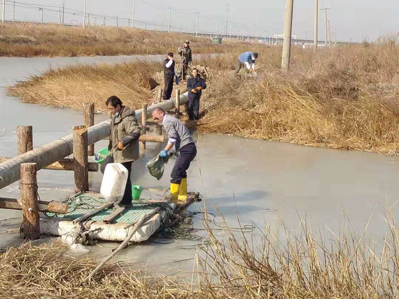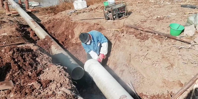 方案是拿出来了,但苛刻的现场环境、严峻的施工条件像冬季的阴霾再度笼罩在大家心头!河对岸无交通桥梁人员无法直达对面,利用船只过河又面临着河面结冰。以往这种距离的过河都是采用PE管(质地柔软弯曲性能优越),但购买PE管道的成本太高。玻璃钢管道本来就比较脆弱易碎,更何况是三节连接在一起长达36米的过河管道,这在盐场管道施工史上还没有先例。