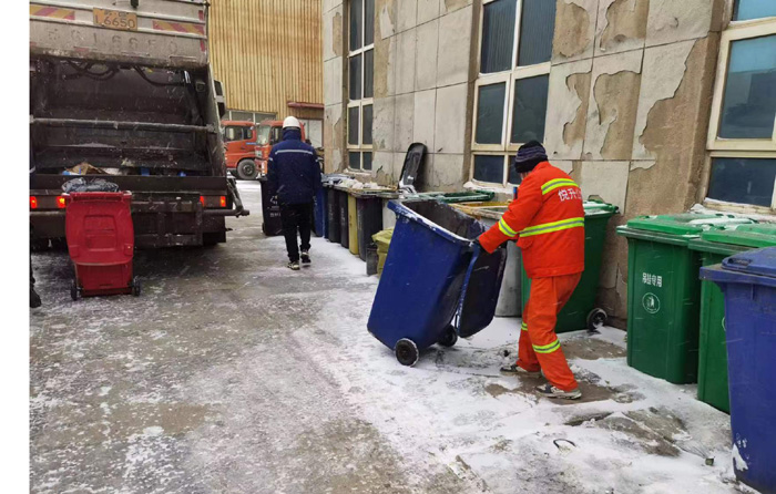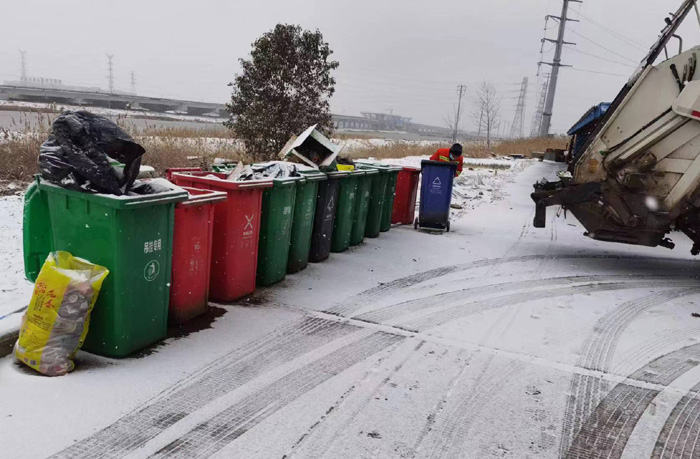 垃圾清运工作绝不后退。暴雪之中垃圾收运工作极其困难,既要面临严寒考验,又要防范雪中路滑。垃圾收运职工们清晨五点多天未晓白时即已全面开展工作。面对雪天路滑,他们小心翼翼的做好每一桶垃圾的收运和倾倒。严寒之中,面颊和双手被冻的通红,忙碌的汗水湿透衣襟,他们也马不停蹄的做好徐圩新区范围内大小七八十个垃圾收运点垃圾清收工作,只为给片区居民和企业创造和谐的卫生环境,没有任何艰难畏阻他们行进的步伐。