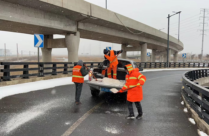 扫雪除冰工作刻不容缓。按照悦升公司扫雪除冰工作任务分配,环卫分公司负责228徐新路到环保大道路段扫雪除冰任务。该区域内因含有张圩互通大桥,光桥梁匝道、辅道就有8条,上下路段非常陡滑,给扫雪除冰工作带来极大挑战。但该公司人员坚决认领任务,没有任何退缩。他们采取车辆缓慢行驶方式,桥梁陡峭路段就使用人工用铁锨一锨一锨端洒的方式进行。虽然寒风雪天中,不停的作业使胳膊泼洒的极其酸累,但大家不辞辛苦,没有一丝怨言,全体人员全部值守在岗,奋战在扫雪除兵工作第一线,仅24日一天,就泼洒融雪剂7车近30吨,为打赢扫雪除冰功坚战打好坚实基础。(晁华)