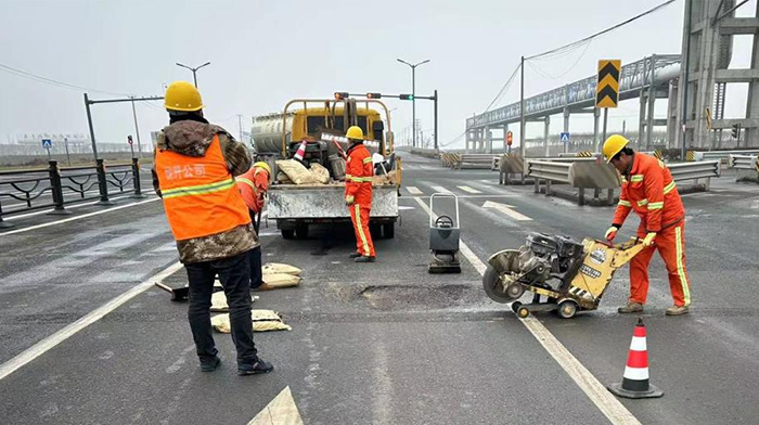 连日来,为了保障新区道路平稳畅通,市政分公司组织专业力量,分组开展坑洞修补。市政维修人员加班加点先后对港前大道徐新路、海滨大道、石化区陬山路等重点道路大小坑塘30余处破损部位进行修补