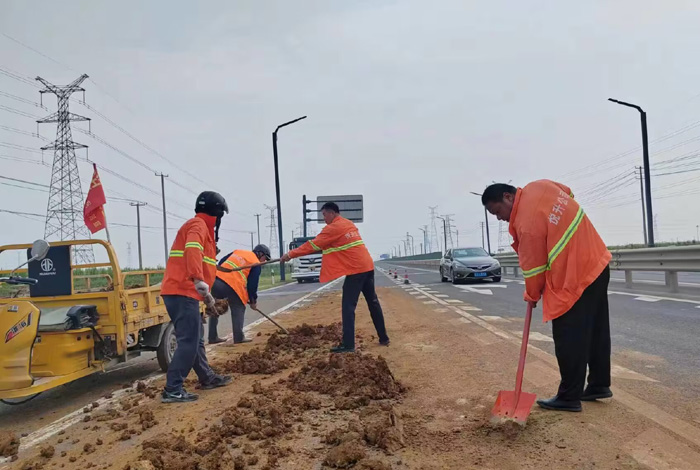 727日上午,临近下班之时,该分公司228省道班长姚功,接到公司应急处理电话,疏港大道向西路面近1500多米长,车辆抛洒严重影响往来车辆安全经过。正在下班的途中他二话没说,调转车头奔赴事发地点疏港大道,迅速摆开安全锥,挥动手中铁铣开始突击清理路面上矿土,石块。闻讯得知此事,共产党员纪树好,胡可贵,班组成员孙洪召等同志二话没说,一并赶往现场支援,橙色工作服在阳光照耀下显得格外靓丽。工作现场,遇到大的石块他们就用手搬,小的、碎的就用铁锨和扫把清理,中午的阳光火辣辣的,他们就这样顶着烈日奋战近两个多小时,共转运矿土泥块、石子近10余车,高质高效保障了核心道路车辆安全通行。(杨波)