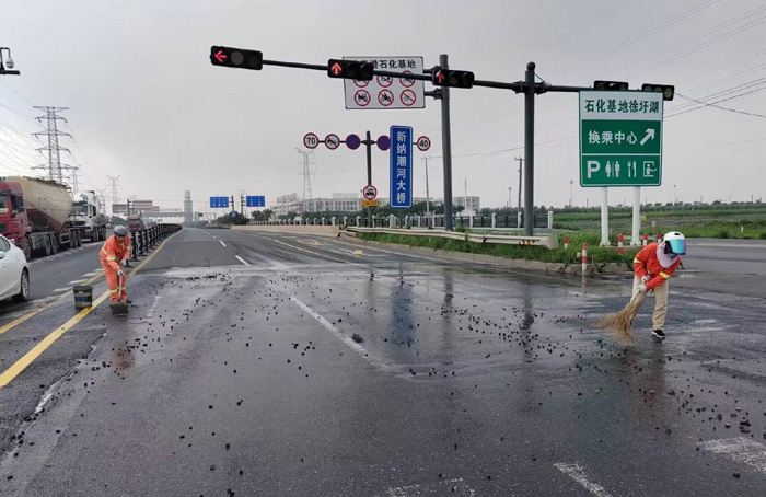 为及时快速排除道路突发障碍,保障路面车辆行人安全畅通,保洁勇士无惧高温炎热天气,快速高效清理路面车辆抛洒,工作中用汗水彰显责任与担当。